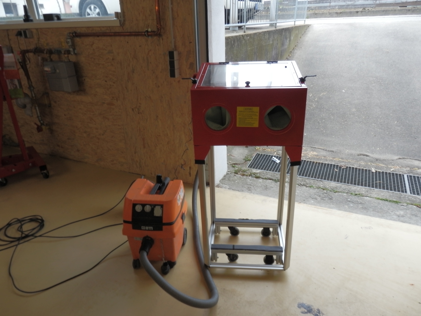 Ich hatte eine Kabine aus Holz. Einfach wie ein Schrank, mit vorne beidseitig zwei U-Profile ne Plexischeibe mit Folie bezogen eingeschoben. Pistole, Handschuhe und Strahlgut hatte ich von TBS. Allerdings braucht es einen sehr potenten Kompressor....