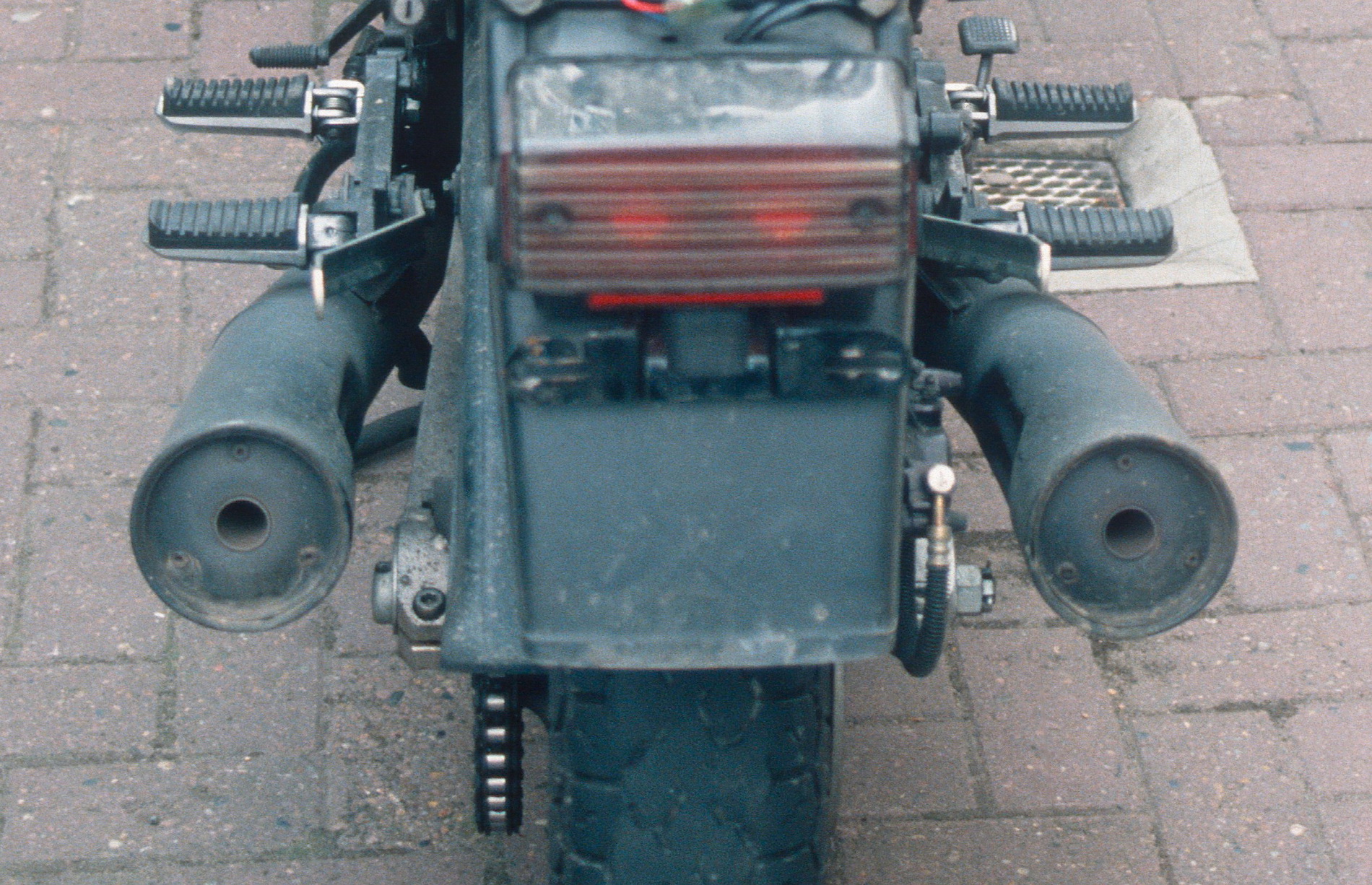 Beim Demontieren stellte sich heraus, dass die einen Unfall hatte. Linker Auspuff + Fußraste verbogen, so dass die Maschine beim Einfedern auf die Achsmutter schlägt.