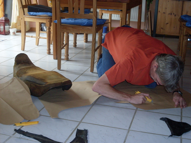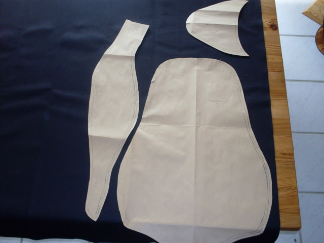 Danach dann die einzelnen Teile auf Papier übertragen, und dabei die schon fehlenden Stücke "interpolieren". Auf Anweisung der Schneiderin habe ich auch die Nahtzugabe etwas großzügiger bemessen: