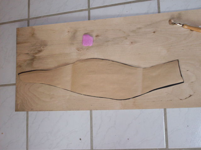 Dann wird es langsam ernst... Die Papierteile auf dem Kunstleder einigermaßen günstig angeordnet