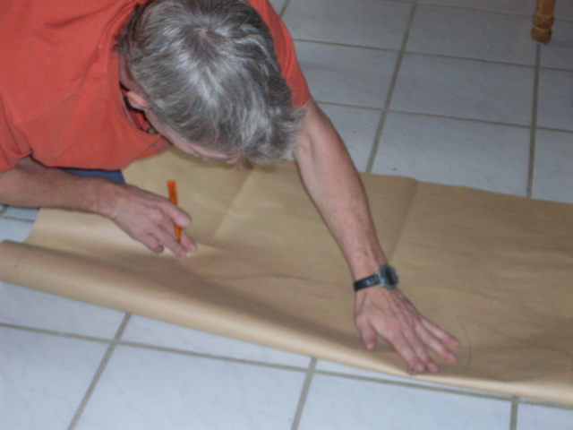 Danach dann die einzelnen Teile auf Papier übertragen, und dabei die schon fehlenden Stücke "interpolieren". Auf Anweisung der Schneiderin habe ich auch die Nahtzugabe etwas großzügiger bemessen: