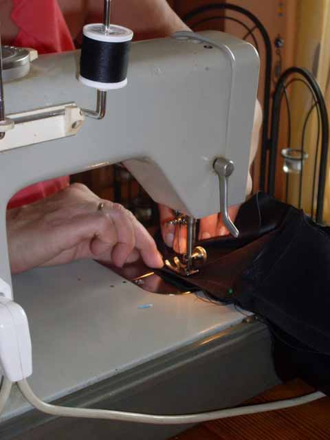Nachdem dann die Nahtzugaben auf dem Kunstleder markiert sind (mit diesem kleinen Stachelrädchen oben links), das Ganze mit Stecknadeln fixieren und an die Nähmaschine...